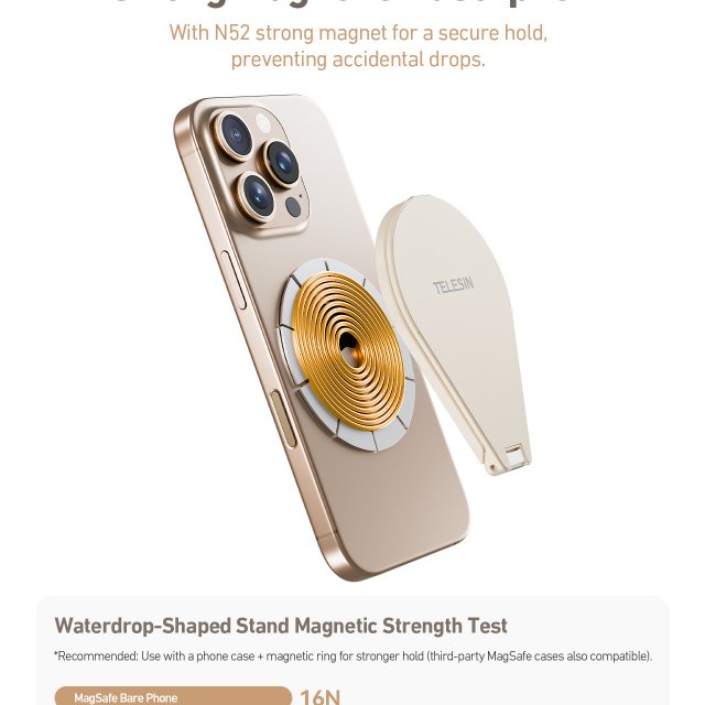 This compact yet powerful stand offers a full 300° rotational range for easy, controlled adjustments. A strong N52 magnetic hold keeps your phone securely in place, while the stylish waterdrop-inspired design adds elegance to any desk or workspace. Multiple shooting modes allow you to switch instantly between portrait, landscape, low-angle, floating, upward, and extended handheld views. Built with a durable aluminum alloy structure and cushioned with silicone pads, it ensures stability without scratching your phone. Lightweight at just 1.7 oz and only 3.7 in. long when folded, it’s the ideal travel companion for creators on the go.