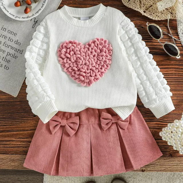 Made from soft polyester fleece, this set keeps your little one warm without feeling heavy. The long bubble sleeves add a sweet touch of volume, while the heart pattern gives it a cheerful vibe that’s perfect for the season. The pullover top makes dressing easy and fuss-free, and the short pink skirt adds just the right amount of twirl for an active day full of fun.