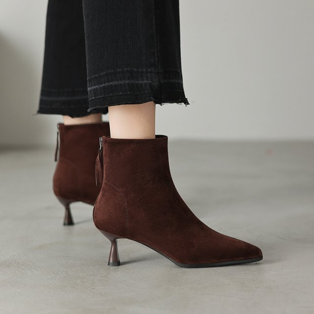 Made from high-quality cow suede and kid suede, these boots offer a smooth, velvety texture that instantly elevates any outfit. The short plush lining and insole keep your feet warm during winter days, while the durable rubber outsole ensures steady traction. A convenient zipper closure provides a snug fit and easy wear. With a graceful 2.1 in (5.5 cm) thin heel, you’ll enjoy added height without sacrificing comfort. Perfect for work, evenings out, and stylish winter strolling, these boots bring versatility to your wardrobe.